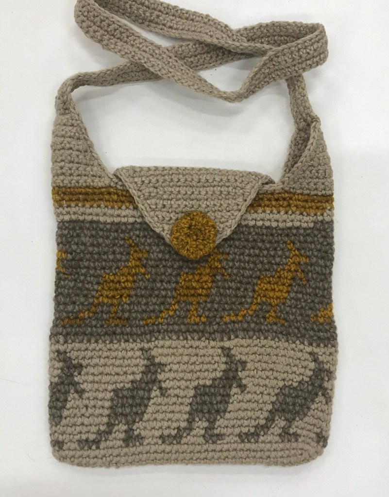 My bags are made from left over carpet wool which I use for hand-woven floor rugs and wall hangings. The strength of the wool makes a very durable bag. You can use any strong wool and hand spun. The patterns I have for sale are now free, they include pictures and text with a grid to follow for the design. The wool is used double when making the bags. Strength is given to the bag because of the way you carry the wool in the design as you go. I have made hundreds of bags and am asked often how do my fingers and hands stand up to it. Luckily very well, however I do use a special ergonomic hook made especially. This is a great help as it means the whole hand is working the hook not just the fingers.